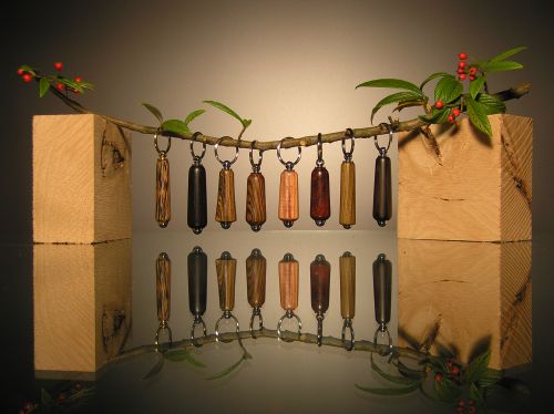 Schlüsselanhänger: v. l. Palmenholz, Afrikanisches Ebenholz, 2x Bocote, Bahia-Rosenholz, Cocobolo, Pockholz, Makassar-Ebenholz