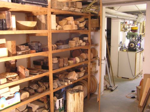 Das Trockenholz-Lager. Im Keller neben der Werkstatt befindet sich ein kleiner Vorrat an einheimischen und exotischen abgelagerten Hölzern sowie vorgesägte Rohlinge für flache Schalen und Teller.